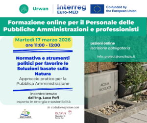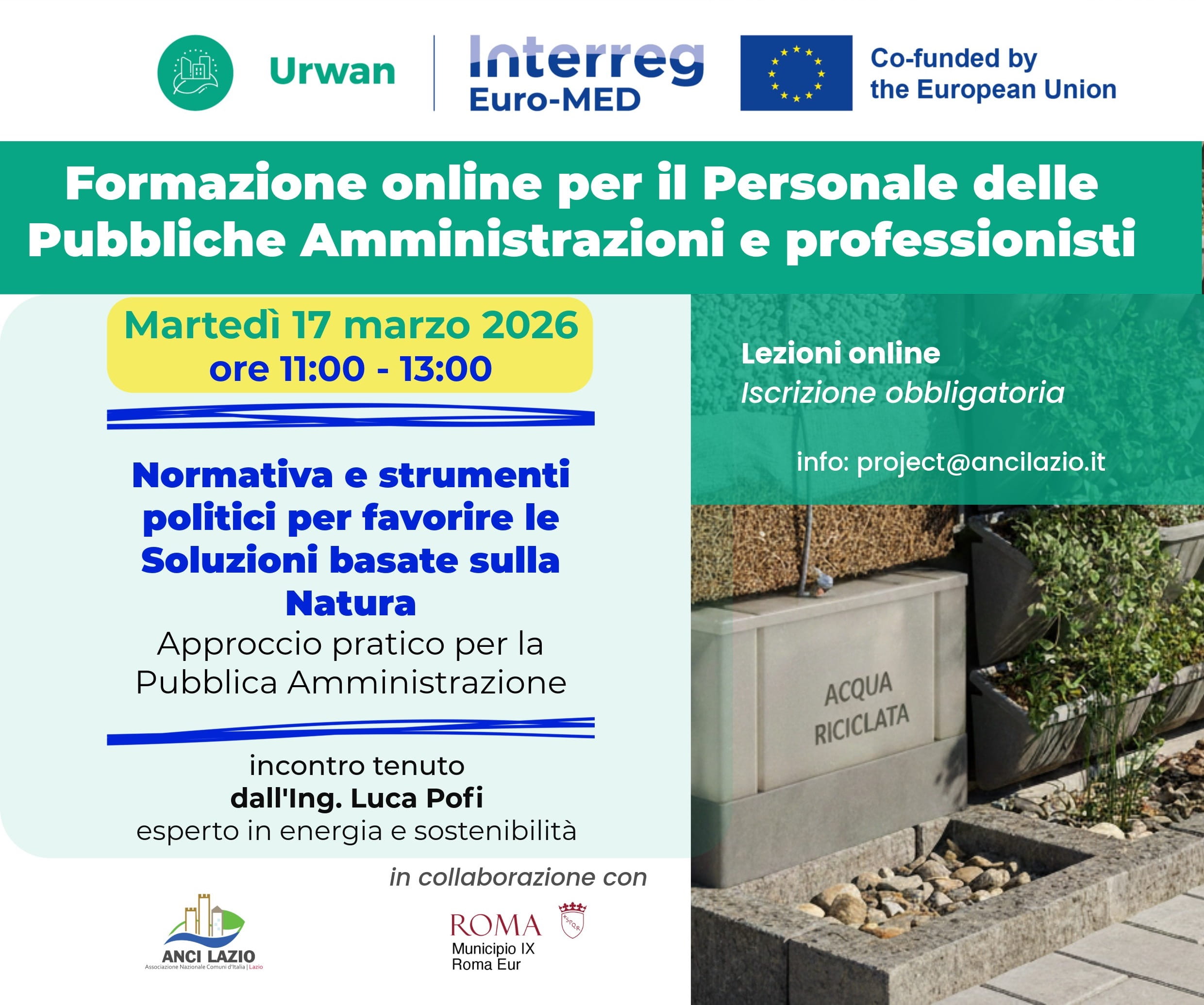 Nell’ambito del progetto URWAN, ANCI Lazio, in collaborazione con Roma Capitale – Municipio Roma IX, organizza due incontri di formazione online in italiano sulle Soluzioni basate sulla Natura (NbS), rivolti a personale delle Pubbliche Amministrazioni e professionisti.
